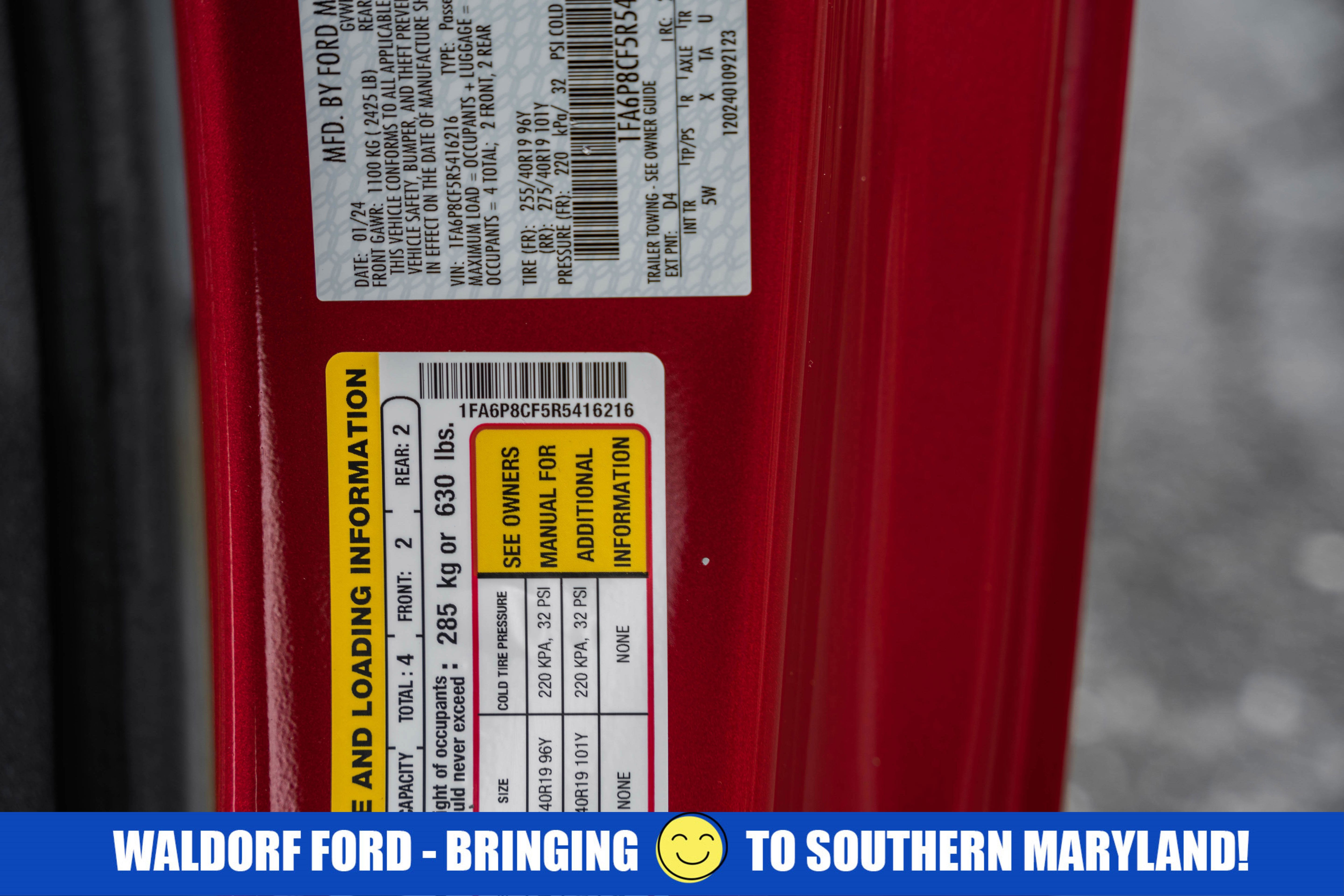 Open your door to the world of adventures with the sleek Rapid Red Metallic Tinted Clearcoat 2024 Ford Mustang. The Automatic 5.0L V8 Ti-VCT is built for the long haul, and packed with features such as , Equipment Group 401A High Package (B&O Sound System by Bang & Olufsen, Illuminated Door-Sill Scuff Plates, Integrated Turn Signals, Leather-Trimmed Bucket Seats w/Color Accents, and Memory Driver Seat & Mirrors), Ford Co-Pilot360 Assist+ (Connected Built-In Navigation and Pre-Collision Assist w/Automatic Emergency Braking), GT Performance Package (19" Branded Brake System w/Performance Linings, Black Painted Strut-Tower Brace, Ebony Black Grille, Electric Hand-Operated Parking Brake (Drift Brake), Front Towing Hooks, Heavy-Duty Front Springs, Performance Raised Rear Wing, Unique Chassis Tuning, Unique Stability Control, Upsized Rear Sway Bars, and Wheels: 19" x 9" Fr/19" x 9.5" Rr Carbonized), and Security Package (Active Anti-Theft System, Locking Center Console, and Wheel Locking Kit). If you think the pictures look pretty just wait until you see it in your driveway! This Mustang is big enough to fit everything you need for your day, plus whatever else life throws at you.